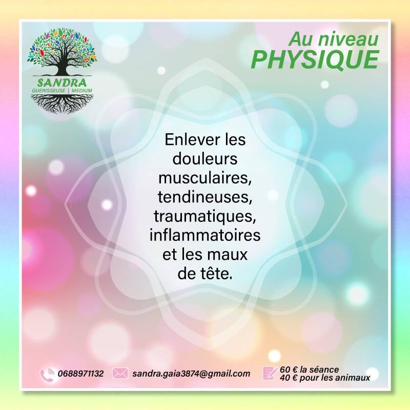 Tous les soins que je propose vont toujours chercher la source réel du problème afin d'agir à sa racine et de pouvoir l'éradiquer. parfois il faudra plusieurs séances cela dépend de chacun. En présentiel ou à distance.